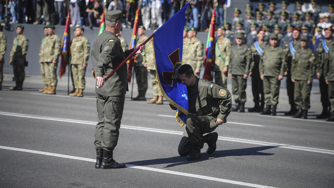 Після промови Петро Порошенко вручив командирам частин та підрозділів Збройних сил, які брали та беруть участь в антитерористичної операції на сході України, бойові знамена зі стрічками «За мужність».