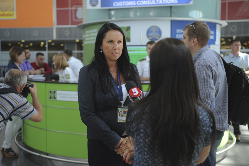 На знімку: прес-секретар Міжнародного аеропорту «Бориспіль» Оксана Ожигова спілкується з представниками ЗМІ.