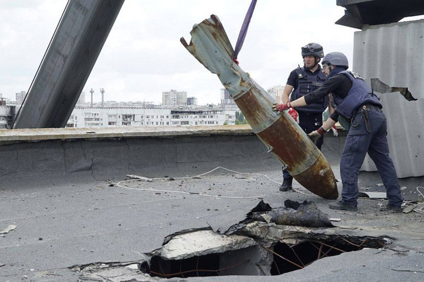 Працівники ДСНС витягують авіабомбу в Харкові. Фото: ДСНС